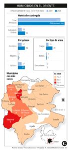 Hablando del Suroeste, en los 23 municipios de esta subregión es donde más asesinatos se han presentado, aún con reducción, si se comparan los números con 2025. Este año van 69, mientras que el año pasado iban 72.