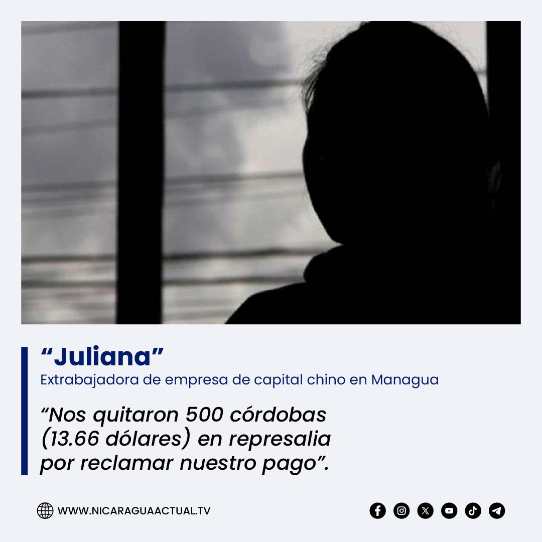 “Juliana” detalló que, aunque les pagaron ese mismo 31 de diciembre, en víspera de Año Nuevo, los empresarios chinos en represalia les descontaron 500 córdobas (uno 14 dólares) y despidieron a más de una docena de los trabajadores, incluyéndola, de manera injustificada.
