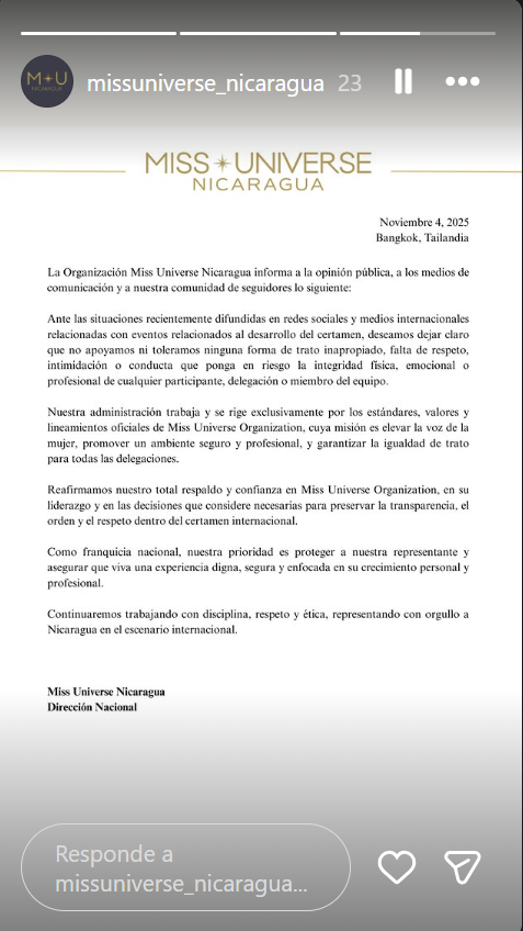 “Como franquicia nacional, nuestra prioridad es proteger a nuestra representante y asegurar que viva una experiencia digna, segura y enfocada en su crecimiento personal y profesional“, añade.